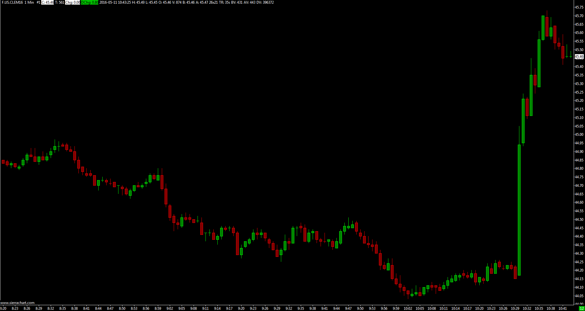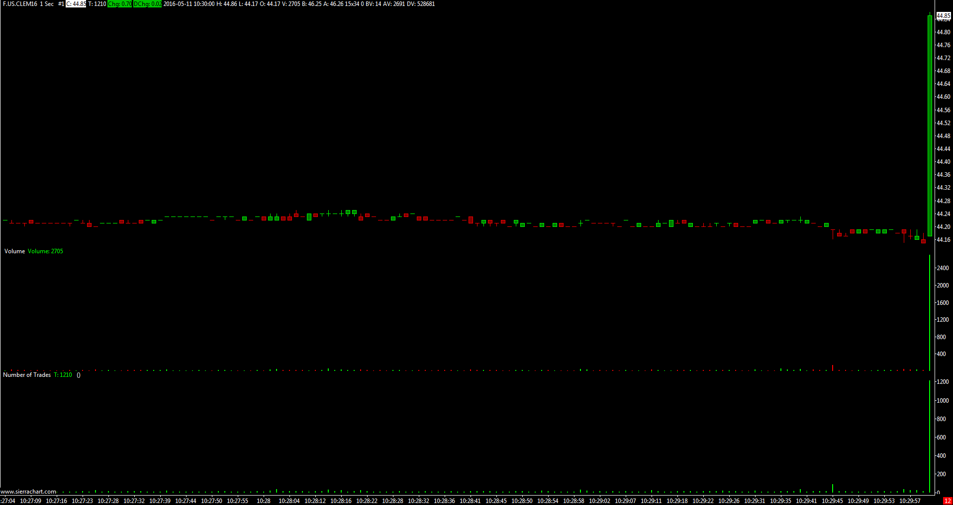 Actually, the Sierra Chart data feed did very well even though you do notice the gap. We checked CQG and they transmitted half the volume. Although you do not see the gap, the volume from CQG was 995 for that second (10:30:00). The Sierra Chart data feed volume is 2018 for that symbol. We are also checking this further and noticing the CQG data feed was lagging. The Sierra Chart data feed did not lag. So it appears our prior conclusions were wrong. The Sierra Chart data feed performed much better than CQG. Sierra Chart Support - Engineering Level Your definitive source for support. Other responses are from users. Try to keep your questions brief and to the point. Be aware of support policy: https://www.sierrachart.com/index.php?l=PostingInformation.php#GeneralInformation For the most reliable, advanced, and zero cost futures order routing, *change* to the Teton service: Sierra Chart Teton Futures Order Routing Date Time Of Last Edit: 2016-05-11 18:08:32