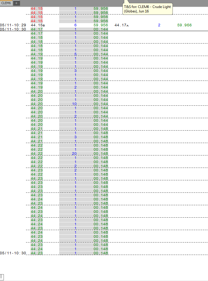 I did have some time today and checked CQG WebAPI data. Please take a look at the screenshot. It's showing exactly 2705 contracts traded. Please note, I didn't perform re-downloading. It is as it was recorded yesterday on my system. I guess there was a sort of confusion with volume/trades during yesterday discussion.There are also gaps in data for N and Q, possibly for other NYMEX contracts. The EIA release readings were very surprising for majority of market participants what resulted in very abrupt and strong move in crude and products prices. Date Time Of Last Edit: 2016-05-12 17:28:50