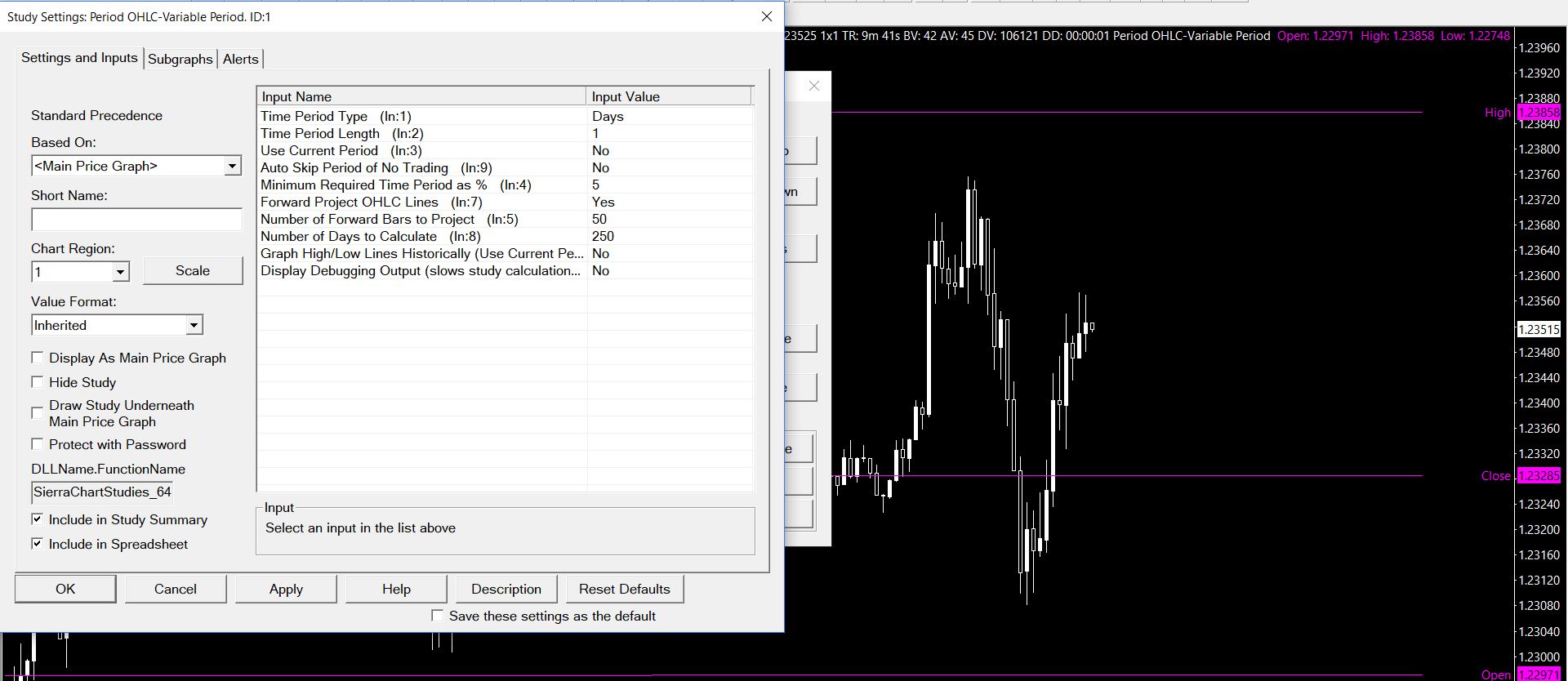 Hi, I tried this study - "Period OHLC - Variable period" and is drawing lines forward for example if you define this parameter "Number of forward bars to project" it projects OHLC for the number of bars to the future. BR V. |