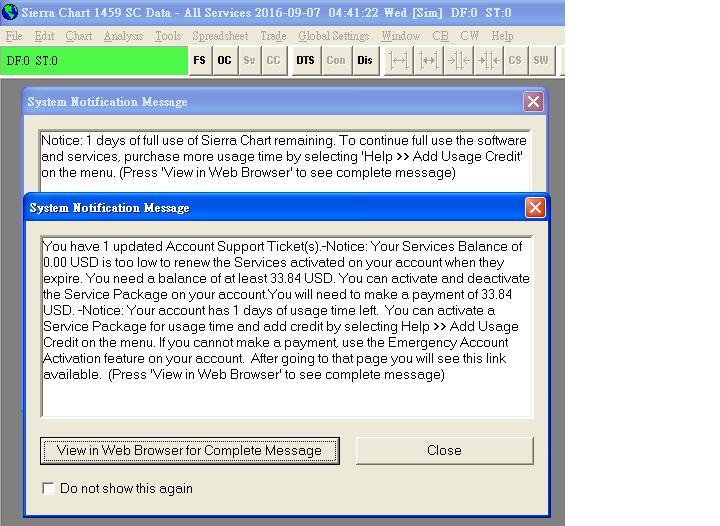 Furthermore, I get 4 days remaining, when I open Sierra Chart and not able to load data. Does anyone have any suggestions on what wrong it is? Thanks in advance for any suggestions Date Time Of Last Edit: 2016-09-05 12:12:09