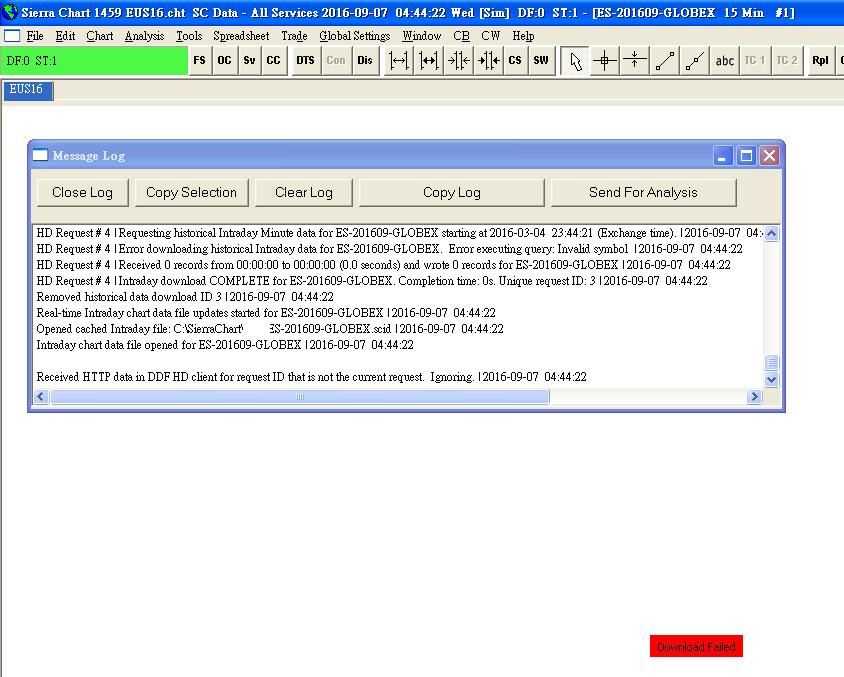 Regarding the problem with not being able to load data, we need more of a clear description and we need to know what particular symbol you are having a problem with. Let us know. Just tell us one of the symbols. Provide a copy of the Message Log by following these instructions: http://www.sierrachart.com/index.php?l=PostingInformation.php#MessageLog Sierra Chart Support - Engineering Level Your definitive source for support. Other responses are from users. Try to keep your questions brief and to the point. Be aware of support policy: https://www.sierrachart.com/index.php?l=PostingInformation.php#GeneralInformation For the most reliable, advanced, and zero cost futures order routing, *change* to the Teton service: Sierra Chart Teton Futures Order Routing Date Time Of Last Edit: 2016-09-06 05:45:19