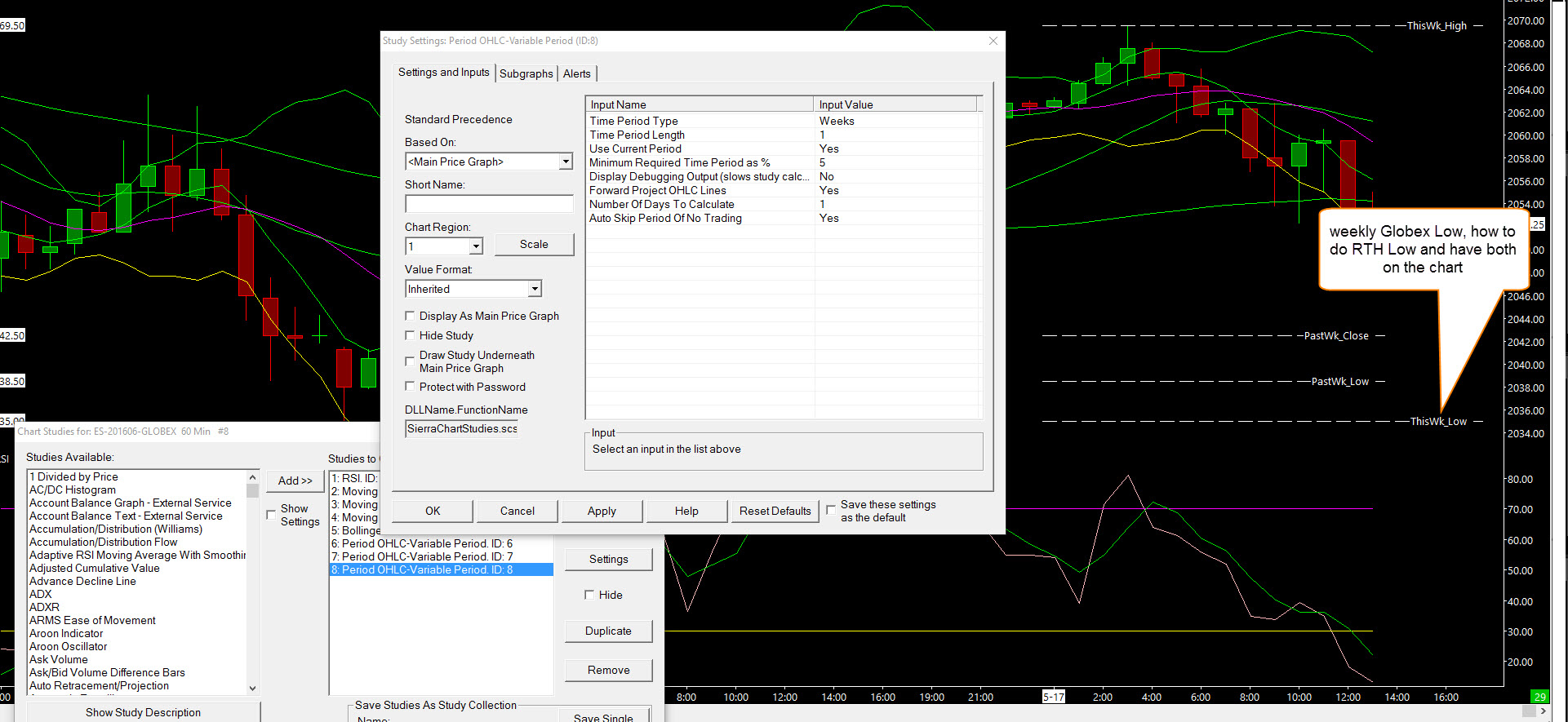 Am using Period OHLC set to week 1 to get this weeks high and low. However for ES futures, how to do just a RTH high low and show both globex and RTH high/lows? Pls. see attached. I have my chart set to use evening timeframe and regular hours as well. Any thoughts appreciated |