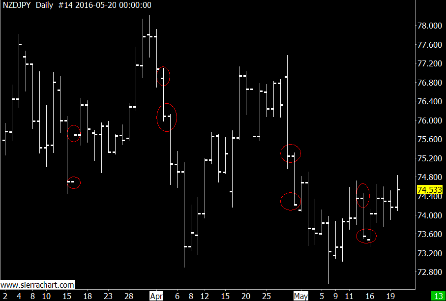 Hello everyone! Can someone please create some sort of alert (colored bar or a dot signal beyond a bar) when a simple criteria is met: "A bar opens at 20% extreme and closes on the other 20% extreme of its price range". For example: Low of bar is 100, high is at 200. Open is at 120 and close is at 180. You see that Open/Close of that particular bar were on the extreme ends, at their 20% extremes. Attached is also a visual example (not all examples are circled, just a few so you get an impression). =========================== The idea comes from Linda Raschke's book Street Smarts where she made some statistics that show very high odds of breaching that bar's high/low the next day. It's a good quantitative model within good trend trades could be made). =========================== Thank you!! Date Time Of Last Edit: 2016-05-21 07:38:00