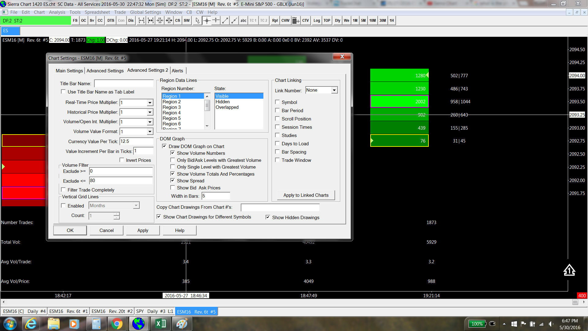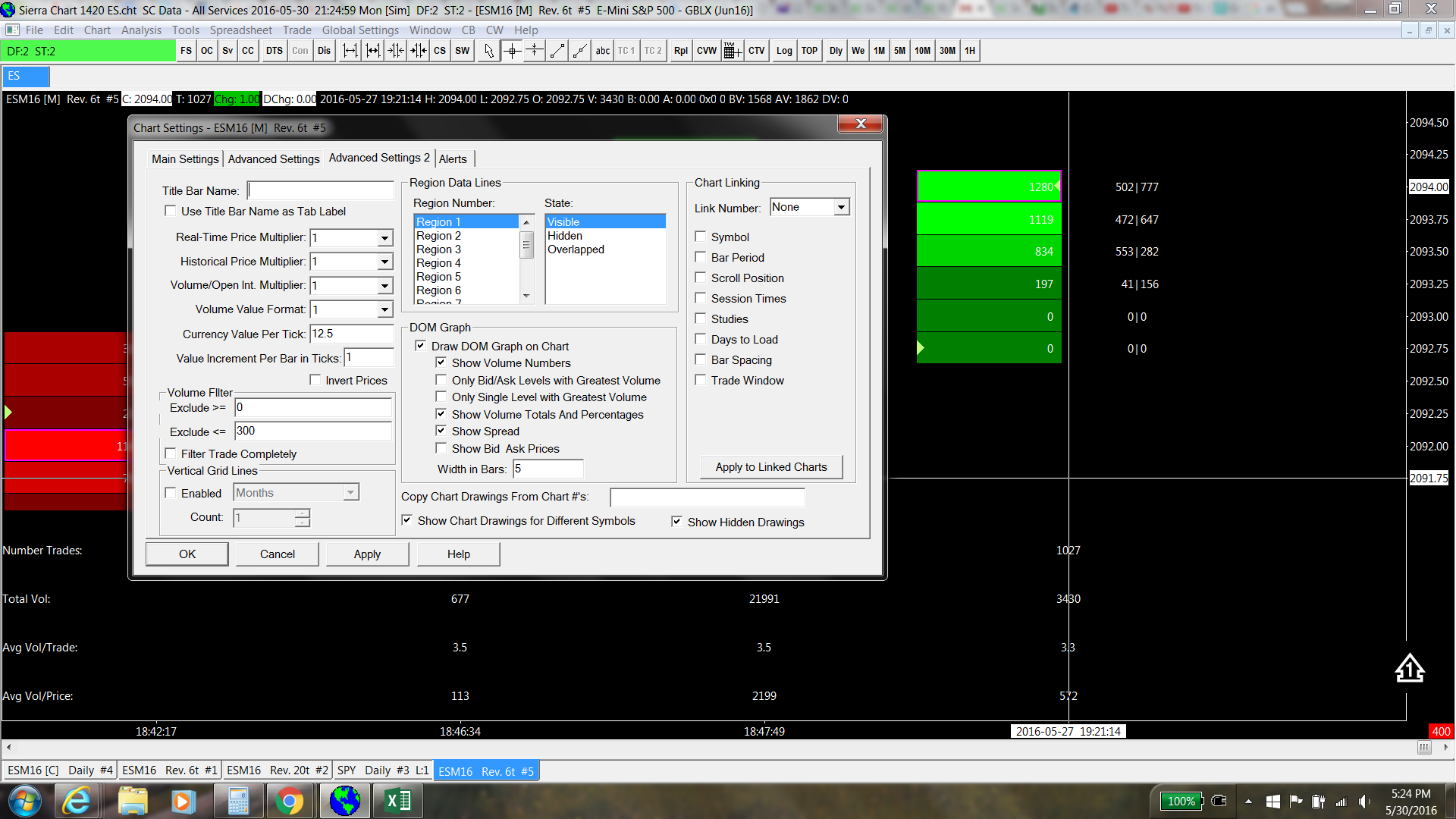 HI, Thanks for your app and I am in trial period. I have strong interest in playing with your app and learn. When I play with the numbered bar chart, I find a problem that could be a bug. So please let me know whether I use your software correctly. Please see the attached image. My numbered bar chart is a reverse chart, ie 0.25*6 PF chart. You can see that I set each bar of the chart to have 2 columns: the left column is the volume, the right column is bid volume*ask volume. I set exclude <=300. Now the problem comes. If you see the last bar in the image, there is a price level with the volume of 197. How could that be? This does not occur once, it happens many times in other bars. Is this a bug? or do I not use your software correctly? Thank you! I am looking forward to hearing back from the support. |