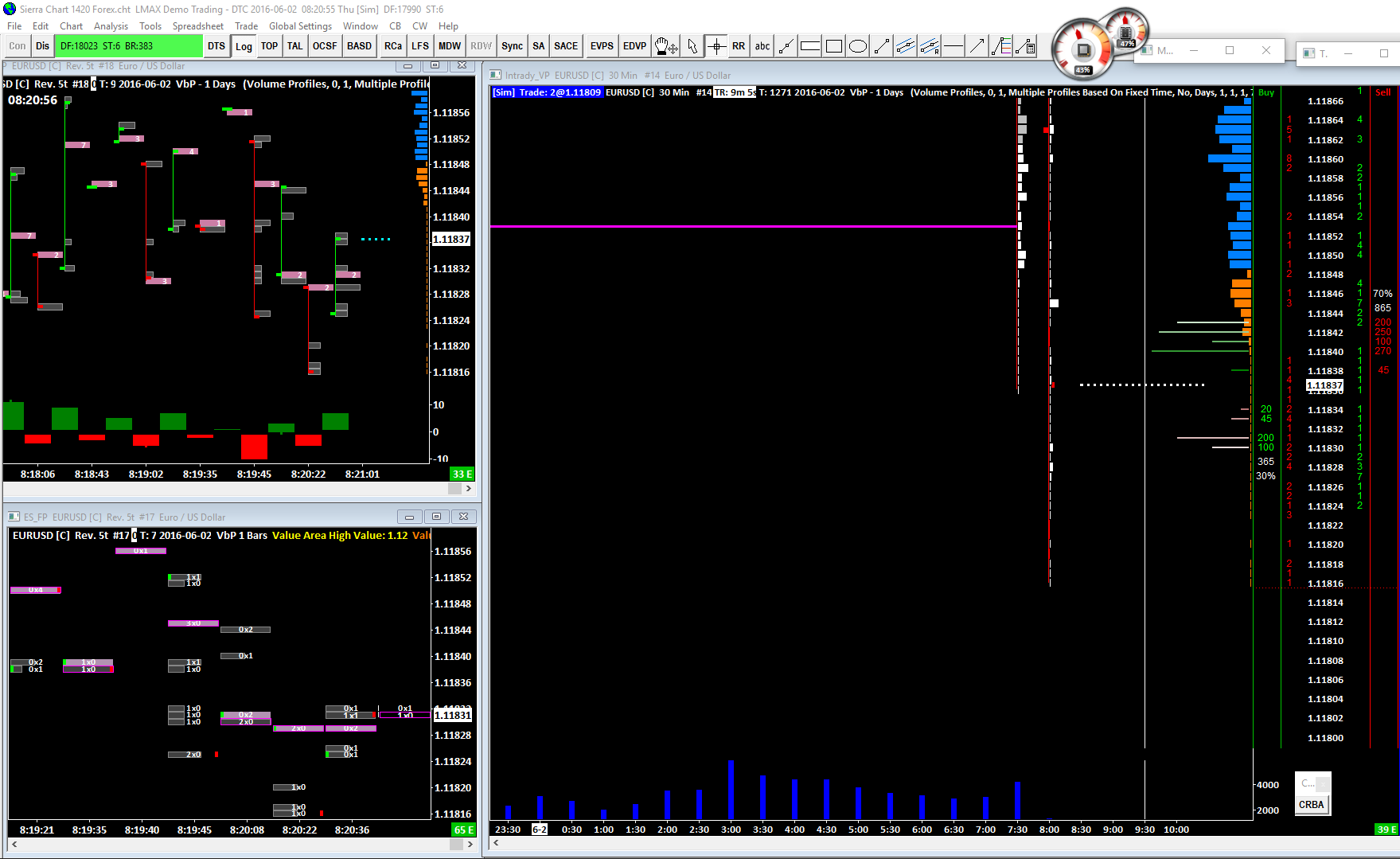 Hi SC team, I'm testing the LMAX data using the demo server and I see a lag in price in different charts of EURUSD. I have only 5 charts in this chartbook. 4 of EURUSD ans one of TICK. Also everything is working very slow with the LMAX data. I removed all my custom studies from the charts but the problem persists. Image attached. Here is the Log: Software version: 1420 | 2016-06-02 08:30:59 Uses New Spreadsheets | 2016-06-02 08:30:59 Usage end date: 2016-07-04 | 2016-06-02 08:30:59 Enabled for: Advanced Features. | 2016-06-02 08:30:59 Enabled for: Advanced Features 2. | 2016-06-02 08:30:59 Enabled for: Sierra Chart Historical Data Service. | 2016-06-02 08:30:59 Allow Support for Sierra Chart Data Feeds is enabled. | 2016-06-02 08:30:59 Current selected Data/Trading service: LMAX Demo Trading - DTC | 2016-06-02 08:30:59 Chart Update Interval: 200 | 2016-06-02 08:30:59 Time Zone: -04:00:00 (EST-05EDT+01,M3.2.0/02:00,M11.1.0/02:00) | 2016-06-02 08:30:59 2016-06-02 15:31:01 Local computer time | 2016-06-02 08:30:59 2016-06-02 12:31:01 Local computer time in UTC | 2016-06-02 08:30:59 2016-06-02 08:31:01 Local computer time in SC Time Zone | 2016-06-02 08:30:59 2016-06-02 12:01:00 Server time in UTC | 2016-06-02 08:30:59 Local computer UTC time and Server UTC time difference: 1 seconds. | 2016-06-02 08:30:59 Program path: C:\SC_Optimus_NoCLR\ | 2016-06-02 08:30:59 Data Files path: C:\SC_Optimus_NoCLR\Data\ | 2016-06-02 08:30:59 OS Version Number: 6.2 | 2016-06-02 08:30:59 Locale Setting: C | 2016-06-02 08:30:59 Unsubscribed from market depth data for EURUSD | 2016-06-02 08:31:30 EURUSD [C] Rev. 5t #18 | Reloading chart. | 2016-06-02 08:31:34 EURUSD [C] Rev. 5t #18 | No contract months found for symbol. Unable to build continuous futures contract chart. | 2016-06-02 08:31:34 EURUSD [C] Rev. 5t #18 | There are no continuous futures contract symbols. Loading data normally. | 2016-06-02 08:31:34 Notice: The study 'TickOnChartSource' has sc.FreeDLL set to true. Use only during development! Set to false to reduce CPU time. | 2016-06-02 08:31:34 TICK-NYSE 2 Min #1 | Reloading chart. | 2016-06-02 08:31:34 ESM6-CME [C] 2 Min #13 | Reloading chart. | 2016-06-02 08:31:34 ESM6-CME [C] 2 Min #13 | Symbol Settings not found for symbol. Unable to build continuous futures contract chart. | 2016-06-02 08:31:34 ESM6-CME [C] 2 Min #13 | There are no continuous futures contract symbols. Loading data normally. | 2016-06-02 08:31:34 EURUSD [C] 30 Min #14 | Reloading chart. | 2016-06-02 08:31:34 EURUSD [C] 30 Min #14 | No contract months found for symbol. Unable to build continuous futures contract chart. | 2016-06-02 08:31:34 EURUSD [C] 30 Min #14 | There are no continuous futures contract symbols. Loading data normally. | 2016-06-02 08:31:34 EURUSD [C] 2 Min #15 | Reloading chart. | 2016-06-02 08:31:34 EURUSD [C] 2 Min #15 | No contract months found for symbol. Unable to build continuous futures contract chart. | 2016-06-02 08:31:34 EURUSD [C] 2 Min #15 | There are no continuous futures contract symbols. Loading data normally. | 2016-06-02 08:31:34 EURUSD [C] Rev. 5t #17 | Reloading chart. | 2016-06-02 08:31:34 EURUSD [C] Rev. 5t #17 | No contract months found for symbol. Unable to build continuous futures contract chart. | 2016-06-02 08:31:34 EURUSD [C] Rev. 5t #17 | There are no continuous futures contract symbols. Loading data normally. | 2016-06-02 08:31:34 Notice: The study 'TickOnChartSource' has sc.FreeDLL set to true. Use only during development! Set to false to reduce CPU time. | 2016-06-02 08:31:34 TICK-SP 2 Min #20 | Reloading chart. | 2016-06-02 08:31:34 NISS-SP 2 Min #3 | Reloading chart. | 2016-06-02 08:31:34 Requesting market depth updates for: EURUSD if supported. | 2016-06-02 08:31:46 LMAX Demo Trading - DTC | Clearing market depth for EURUSD. | 2016-06-02 08:31:46 Date Time Of Last Edit: 2016-06-02 12:32:51