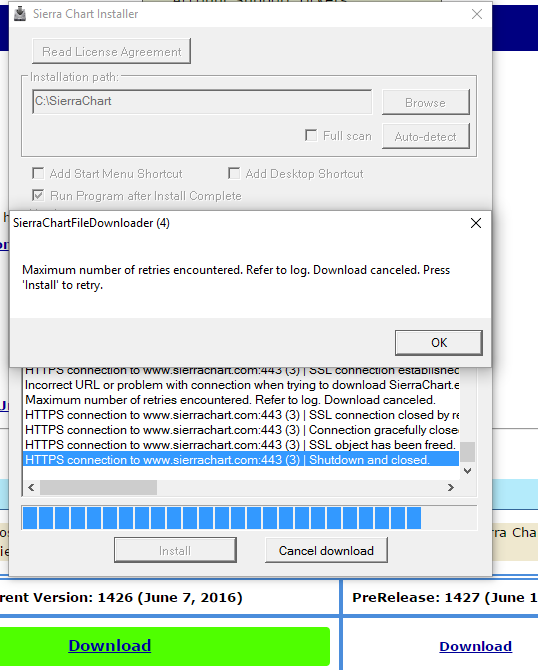 There were a couple of problems relating to the installer. This is the reason for the problem. This is now solved. Try again following these instructions here: https://www.sierrachart.com/index.php?page=doc/download.php#FastUpdate We apologize for the issue. Sierra Chart Support - Engineering Level Your definitive source for support. Other responses are from users. Try to keep your questions brief and to the point. Be aware of support policy: https://www.sierrachart.com/index.php?l=PostingInformation.php#GeneralInformation For the most reliable, advanced, and zero cost futures order routing, *change* to the Teton service: Sierra Chart Teton Futures Order Routing |