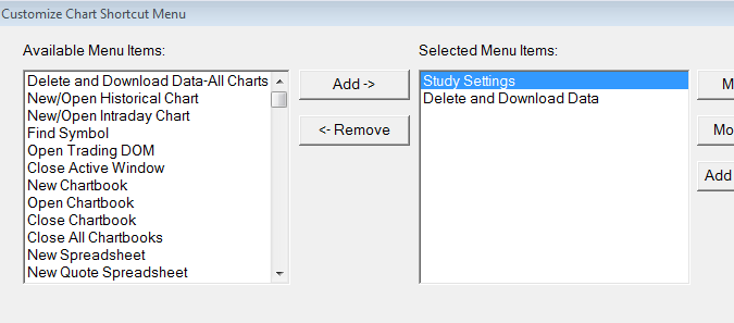This is answered in the documentation here: Global Settings Menu: Customize Chart Shortcut Menu (Global Settings menu) Sierra Chart Support - Engineering Level Your definitive source for support. Other responses are from users. Try to keep your questions brief and to the point. Be aware of support policy: https://www.sierrachart.com/index.php?l=PostingInformation.php#GeneralInformation For the most reliable, advanced, and zero cost futures order routing, *change* to the Teton service: Sierra Chart Teton Futures Order Routing |
