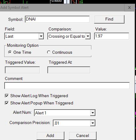 The alert was set from the chart by right clicking on the chart and selecting "add symbol alert." I had several set at the same price---also---I went over the time and sales just to see if there was a gap situation---there was not. Thanks again, c |