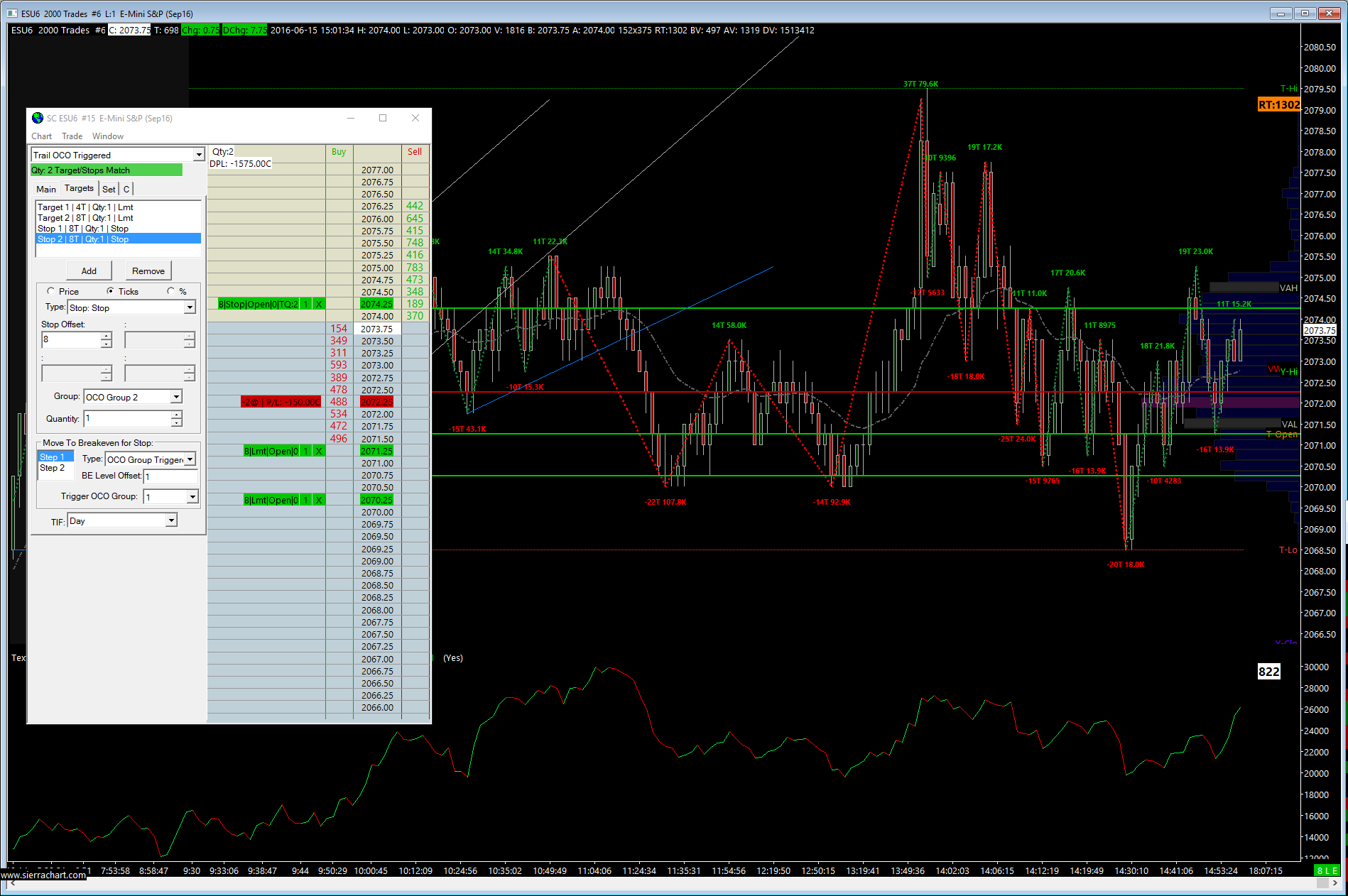 Hello, I've followed the "example 4" in the Same Trade Configuration Doc, but if my FIRST target is set to 4T, and the Trigger Offset is set to 4 Ticks- then if my order doesnt print at +4 Ticks, but the market does- it triggers my trailing stop before my order gets executed. What is the best way to accomplish the following? OCO 1 - Target 4 Ticks OCO 1 - STOP @ 8 Ticks OCO 2 - Target 8 Ticks OCO 2 - Trailing Stop at 8 Ticks, then once Order(OCO) 1 FILLS, it moves to breakeven +1 and continues to Trail at 4 Ticks behind Market price? I've tried for about 2 hours, but keep getting strange behavior of it triggering too early. I've read the Doc thoroughly, but I cant get around this +4 Trigger happening sometimes BEFORE my OCO 1 gets filled. Any ideas would be great! Dion http://www.sierrachart.com/image.php?Image=1466017296819.png Date Time Of Last Edit: 2016-06-15 19:03:50