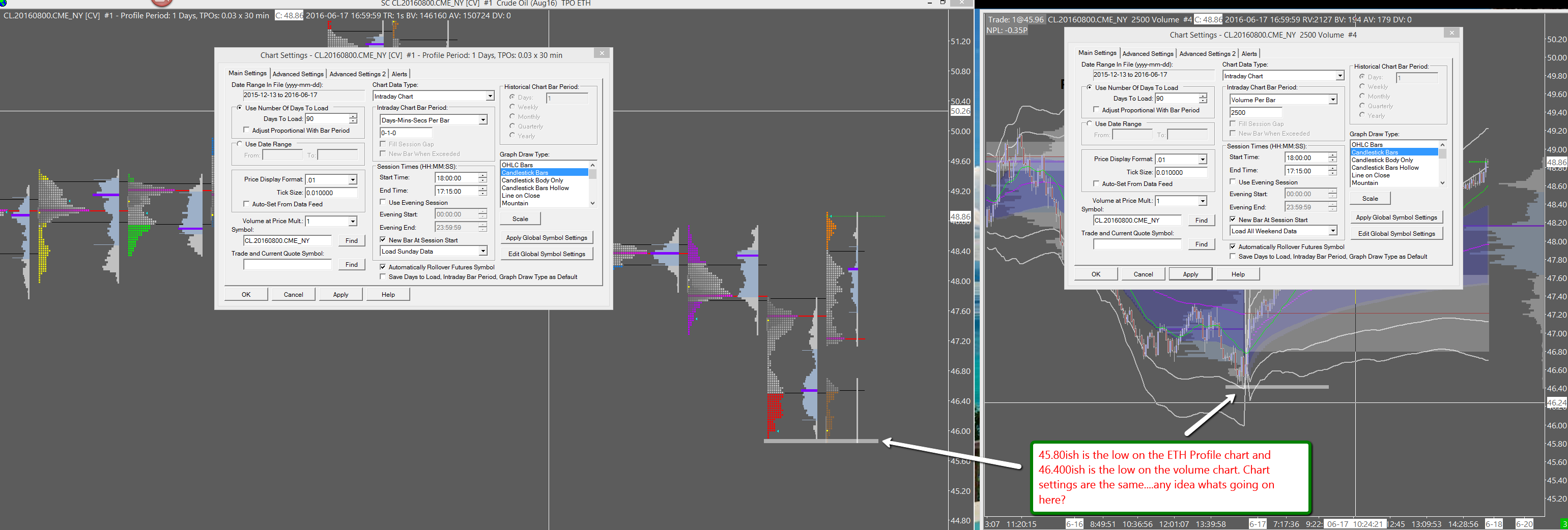 There is no term "volume adjusted rollover". There is Continuous Futures Contract-Volume Based Rollover. You need to choose this same option for your Volume bars chart since you are using it for the TPO Profile chart. Here are instructions: Continuous Futures Contract Charts: Using Continuous Futures Contract Charts There is also this helpful documentation here: https://www.sierrachart.com/index.php?page=doc/doc_ContinuousFuturesContractCharts.html#DisplayingRolloverDatesContractMonths Secondly, the profile chart has a gap in the data. Not sure how to address this. https://www.sierrachart.com/index.php?page=doc/doc_TPOVolProfileCharts.html#ResolvingMissingTPOLettersBlocksCertainTimePeriods Sierra Chart Support - Engineering Level Your definitive source for support. Other responses are from users. Try to keep your questions brief and to the point. Be aware of support policy: https://www.sierrachart.com/index.php?l=PostingInformation.php#GeneralInformation For the most reliable, advanced, and zero cost futures order routing, *change* to the Teton service: Sierra Chart Teton Futures Order Routing Date Time Of Last Edit: 2016-06-20 00:03:17