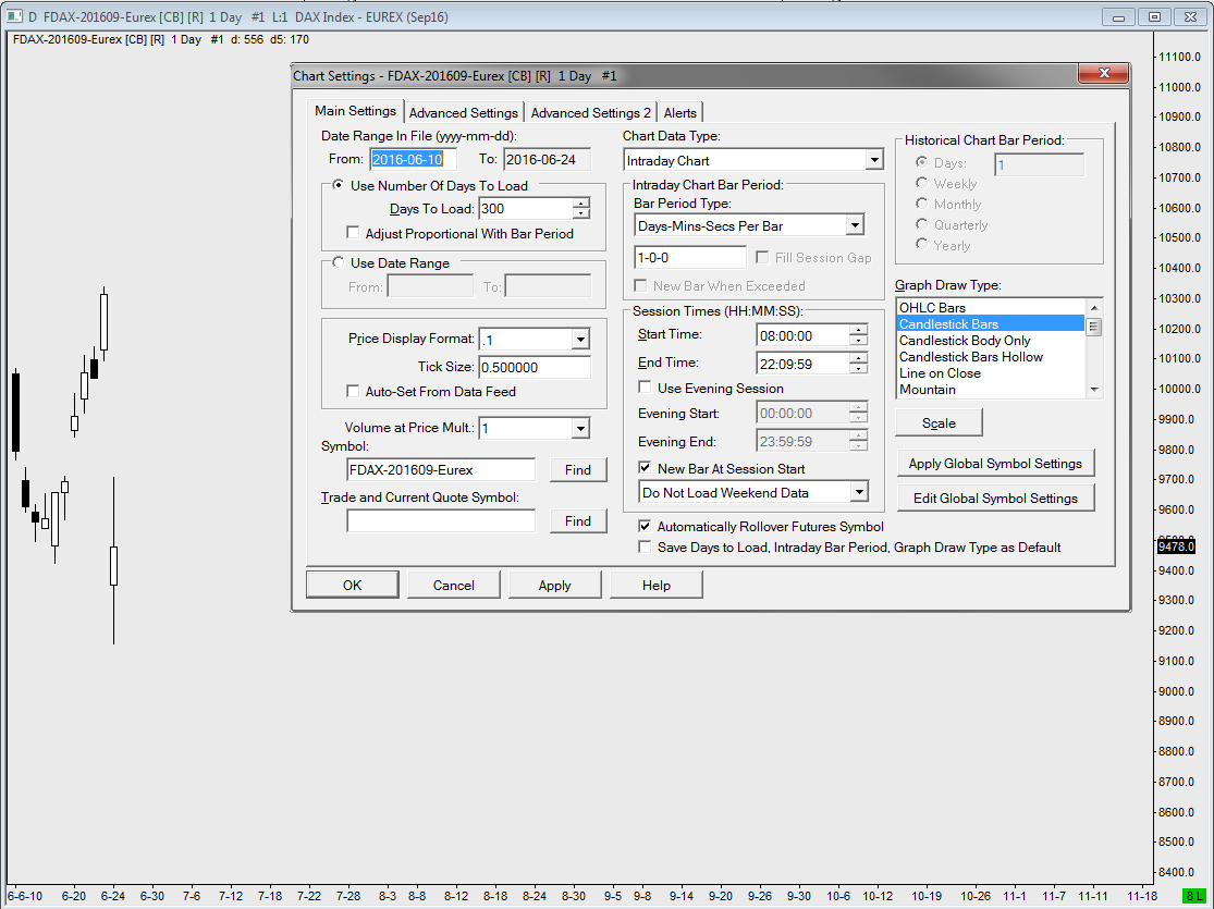I want to use a daily chart with intraday data of the Dax Future in a remote instance of SC. It seems not to be possible to show sufficient data in the remote instance. What am I doing wrong or how can this be fixed? Please see the attached screenshots for my settings.