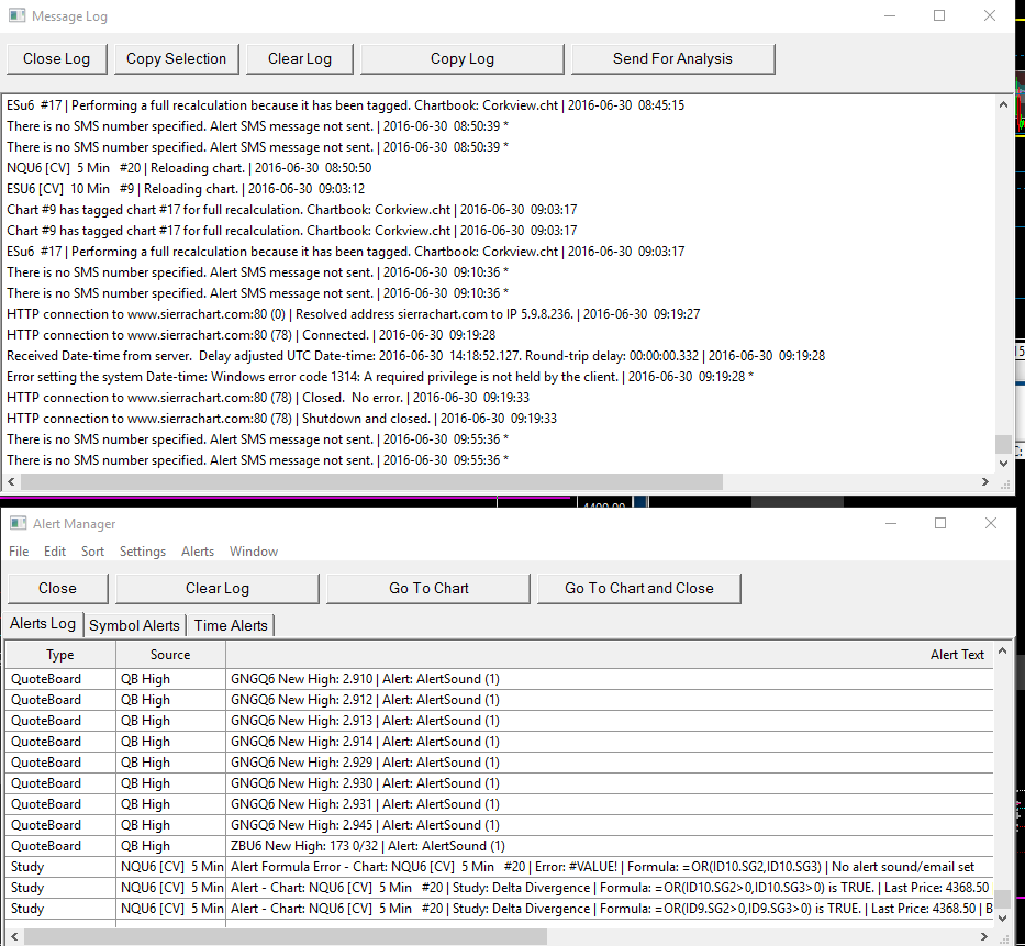 At the time you see the Alert Manager open, select the line in the Alerts Log which was just added and select Edit >> Copy Selection. Paste it here. Check all of the Alert Numbers in the General Settings window to make sure none of them are set to send an SMS message. Here are instructions: https://www.sierrachart.com/index.php?page=doc/doc_GeneralSettings.html#AlertSoundSettings Sierra Chart Support - Engineering Level Your definitive source for support. Other responses are from users. Try to keep your questions brief and to the point. Be aware of support policy: https://www.sierrachart.com/index.php?l=PostingInformation.php#GeneralInformation For the most reliable, advanced, and zero cost futures order routing, *change* to the Teton service: Sierra Chart Teton Futures Order Routing |