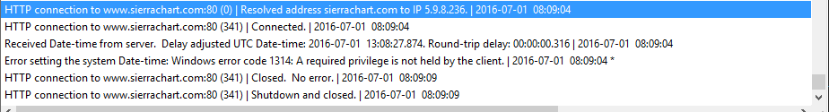 OK ay this just popped up on message Log window -- HTTP connection to www.sierrachart.com:80 (0) | Resolved address sierrachart.com to IP 5.9.8.236. | 2016-07-01 08:09:04 Date Time Of Last Edit: 2016-07-01 13:17:27