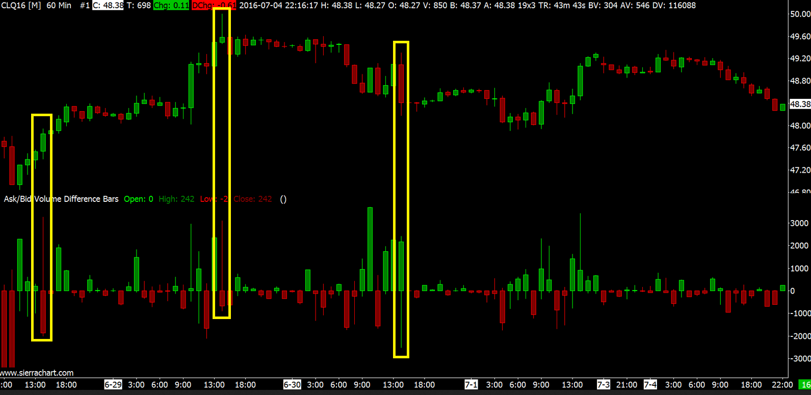 Hello, I´m little bit confused by what I´m sometimes getting from AskBid difference study. Please, see the attached image, yellow rectangle. AskVol is 45339, BidVol 43160, but price went down from open at 49,09 to 48,41. Price movement is in contrary to what´s happening on Ask/Bid. May I ask you about your idea about this? Thank you indeed!