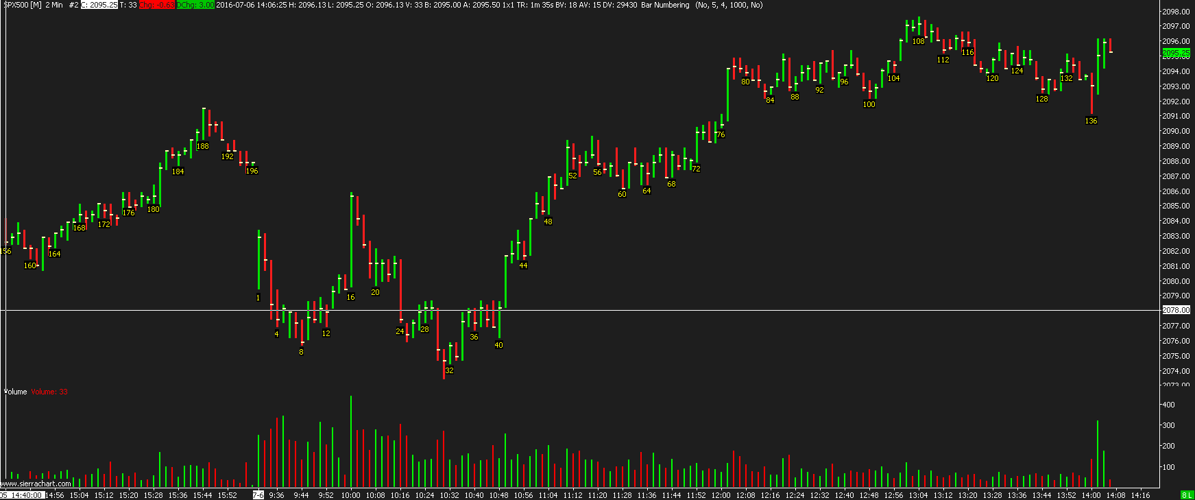 Dear Support, Currently I am a trial user, using a demo account. To this point very satisfied with the platform. However, I am noticing a trend pattern on volume bar color vs price bar color, they are off a bit. To elaborate further they do not always match meaning green does not match green. If the bar closes higher in some instances the volume is displayed natively in Sierra in red in some instances and vice versa. Is there a way to fix this and color match volume bars with price bars? Please refer to the image http://www.sierrachart.com/image.php?Image=1467831419165.png Note: Looking at the chart from bar number 5 which is an up bar (green) does not relate to bar number 6 which closes lower in green (instead of red, which is supposed to) with the corresponding volume bar that displays in red. Looking at bar numbers 17, 18 & 19 they are red down bars (completely accurate display of information) however, the level bar number 20 is displayed in green which contradicts bar numbers 26, 27 & 28 they are green up bars (completely accurate display of information). To that point, bar number 29 is displayed in green (which should be red, point to previous contradiction comment). These are just a few instances however, this is a challenge that represents itself throughout the chart quite often. Much appreciated, Andrew Date Time Of Last Edit: 2016-07-06 22:48:42