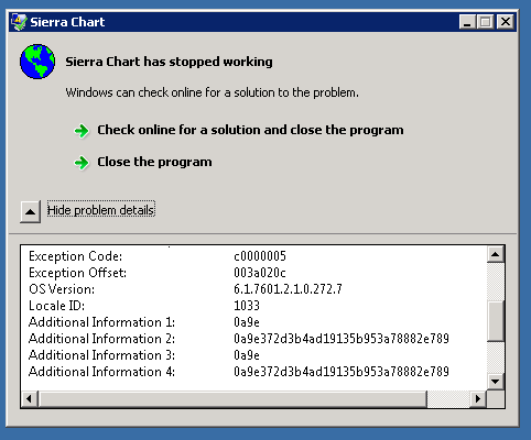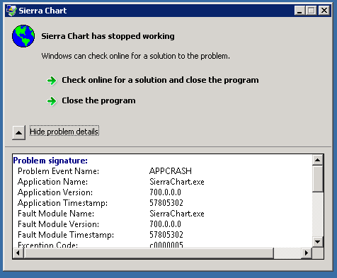 If you are noticing this with a completely fresh installation of Sierra Chart into a new folder, almost certainly it is going to be some operating system related issue. Not sure this would help, but install this redistributable package again: http://www.microsoft.com/en-us/download/details.aspx?id=5555 Sierra Chart Support - Engineering Level Your definitive source for support. Other responses are from users. Try to keep your questions brief and to the point. Be aware of support policy: https://www.sierrachart.com/index.php?l=PostingInformation.php#GeneralInformation For the most reliable, advanced, and zero cost futures order routing, *change* to the Teton service: Sierra Chart Teton Futures Order Routing |