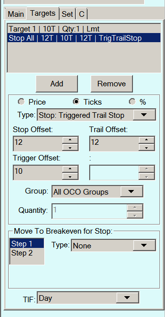 I daytrade YM and I place an initial stop loss of 12 ticks. When the price goes to my favour 10 ticks I move my stop to breakeven with 1 tick BE Level Offset. Until this point I have programmed without problem with an Stop order and "Move to Breakeven for Stop" option. After this step I want my stop to trail the price at a distance of 12 ticks. This is the step I don't know to programm. Could you help me?