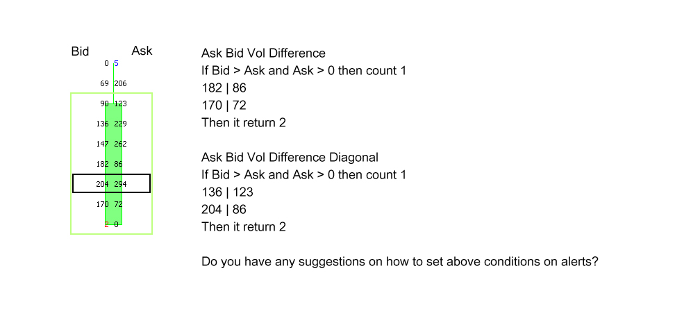 Referring to attached image and given sample, I would like to know on how to define following variables as shown below: //Bid Volume;Ask Volume;Total Volume;Number of Trades;Ask Volume Bid Volume Difference; Diagonal Ask Volume Bid Volume Difference; int Ask_Bid_Vol_Different = Would following code comparing the Ask and Bid vol difference on same level? if (ComparisonMethodIndex == 4) { int AskVolumeBidVolumeDifference = p_VolumeAtPrice->AskVolume - p_VolumeAtPrice->BidVolume; int VolumeThresholdSigned = VolumeThreshold.GetInt(); if (AskVolumeBidVolumeDifference > 0 && VolumeThresholdSigned > 0 && AskVolumeBidVolumeDifference >= VolumeThresholdSigned) ConditionMet = true; else if (AskVolumeBidVolumeDifference < 0 && VolumeThresholdSigned < 0 && AskVolumeBidVolumeDifference <= VolumeThresholdSigned) ConditionMet = true; } int Ask_Bid_Vol_Different_Diagonal = What about the coding comparing the Ask and Bid vol difference on Diagonal level? if (ComparisonMethodIndex == 5) { Since the reference document is not available yet, do you have any suggestions on what variable should be used for retrieving AskVolume and BidVolume at Diagonal level? int AskVolumeBidVolumeDifferenceDiagonal = p_VolumeAtPrice->? - p_VolumeAtPrice->?; } Furthermore, I would like to search for any variable's description, is there any search feature under sierrachart.com? so I can easily to read the description on any variables. Table of Contents | (Advanced Custom Study/System Interface and Language (ACSIL)) Do you have any suggestions? Thank you very much for any suggestions :> Date Time Of Last Edit: 2017-01-27 06:54:17