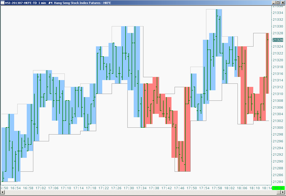 The colours indicate that the highest timeframe is swinging up or down. They change when the prior swings lowest high / highest low is exceded by x (settable). It will work on any time frame but you'll need to rewrite it to count ticks instead of seconds for tick charts. Not impossible, it would just require a bit of thought about the lines: TIME_TO_HMS(sc.BaseDateTimeIn[pos].GetTime(),h0,m0,m); if( fmod(float(m0), timeh) == 0 ) Date Time Of Last Edit: 2013-07-20 12:05:18