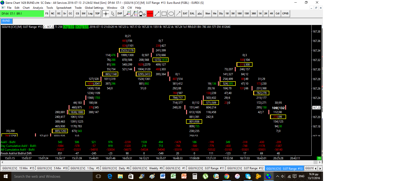 Hello, I noticed a huge anomaly in the numbers bars study and the cumulative delta when opening sierra on my laptop and on my pc. I have attached some pictures to illustrate the problem. No. 1 shows the numbers bar study and the cumulative delta when opened in my laptop and no. 4 shows exactly the same chartbook on my pc, but the cumulative delta is way off and the bid/ask volumes are not correct. I have also attached no.2 and 3 which is a typical 15m candlestick chart showing the volumes for each bar having no problem. The screenshots are from yesterday's trading session in the German Bund. I have no idea why there is so much difference in the bid/ask study when using my laptop or pc. I use the PC for trading and it seems that I have been looking at the wrong data because whenever I perform my analysis later at night using the laptop, the numbers bar study doesn't is completely different. Thank you...