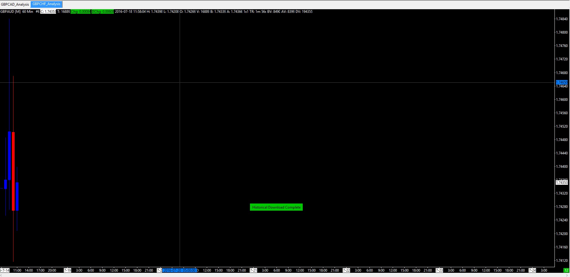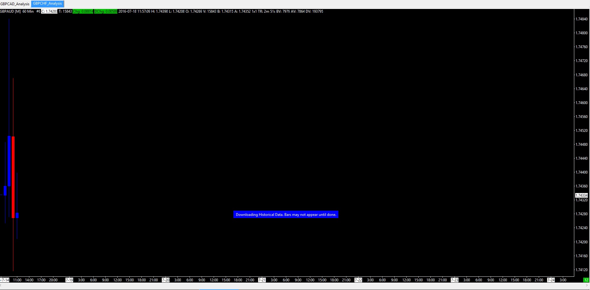 All my symbol are missing data from the 21:00 15/07/2016 to Today 07:00 18/07/2016. Tried deleting data and reloading from the Sierra servers but noting has changed. Actually after deleting all data I only get 1 day data(18/07/2016) after reloading historical intraday data. This is on all symbols. I have even performed a symbol update. Disabled my firewall. Disconnected my vpn. I am using version 1426. Thanks