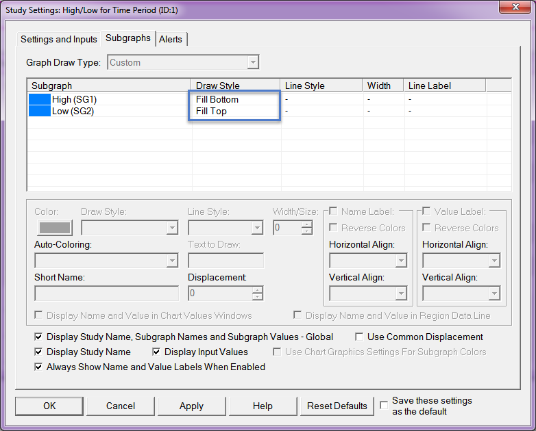 Previously when we read the above, we did not take note of "session". And they wanted to highlight the open they said. So we thought the appropriate study would be Time Line. We were thinking they wanted just the high to low of the first bar of the open highlighted. That does not really make sense because you can already see that. And it does not make sense to use High/Low for Time Period for a single bar because there can be associated problems with that when in the chart bar time frame is changed. Sierra Chart Support - Engineering Level Your definitive source for support. Other responses are from users. Try to keep your questions brief and to the point. Be aware of support policy: https://www.sierrachart.com/index.php?l=PostingInformation.php#GeneralInformation For the most reliable, advanced, and zero cost futures order routing, *change* to the Teton service: Sierra Chart Teton Futures Order Routing |