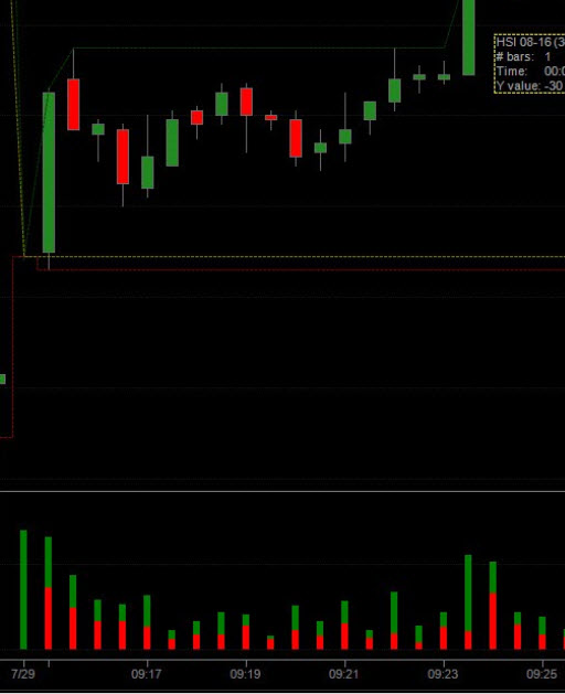 Thanks for your response. I came up with a workaround... I use two studies; 1 - Volume and Bid Volume Studies. 2 - I set Volume at width 9 colour green for both up and down volume so it is a consistent colour for all bars. 3 - I set Bid volume at with 9 colour red and set it up in the same region to scale to the volume study. You basically get the total volume (big green bar) then the bid volume creeping up on it at the same width. The left over at the top of the bar (green) is the balance of the Ask volume by simply math. I did a check of this by setting them all up (with bid volume) in a different region and it looked good. Here is the snap shot attached. So I have got what I wanted with a bit of a work around. PS if you think I have done something incorrect here let me know! |