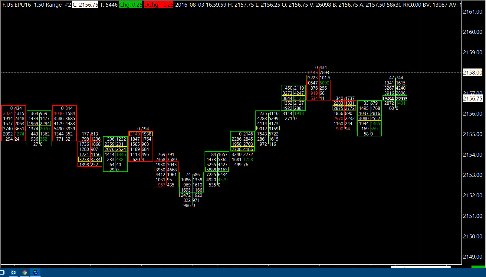 This can be done by using the Numbers Bars study: Numbers Bars And you will also want to use the Numbers Bars Calculated Values study: Numbers Bars: Displaying Numeric Information Below Numbers Bars Each of the sections linked to contain step-by-step instructions. Sierra Chart Support - Engineering Level Your definitive source for support. Other responses are from users. Try to keep your questions brief and to the point. Be aware of support policy: https://www.sierrachart.com/index.php?l=PostingInformation.php#GeneralInformation For the most reliable, advanced, and zero cost futures order routing, *change* to the Teton service: Sierra Chart Teton Futures Order Routing |