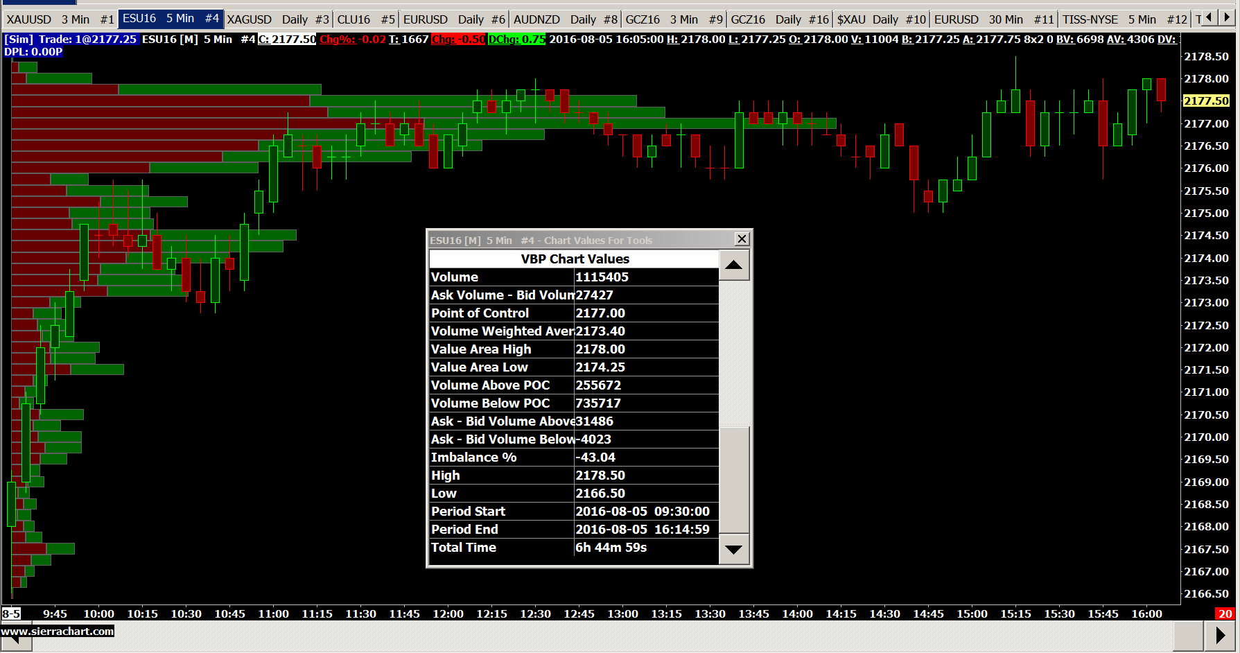 I am interested in the Volume Value Area, not TPO. I am interested in each day's volume profile. I only trade the ES. My Volume Value Area levels for Friday using Windotrader and Investor RT are 2178 and 2174. My levels using Sierra Chart are 2178 and 2174.25. The times are from 9:30 to 4:15. Regular Trading Hours. Date Time Of Last Edit: 2016-08-07 02:46:35