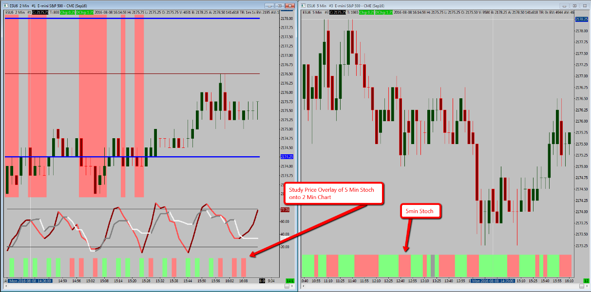 I am overlaying a 5 min Stoch (Colored Background) onto a 2 min chart.....when doing this, I am getting a lot of "gaps". Is there a setting that will make the overlay look more continuous? See link below. |
