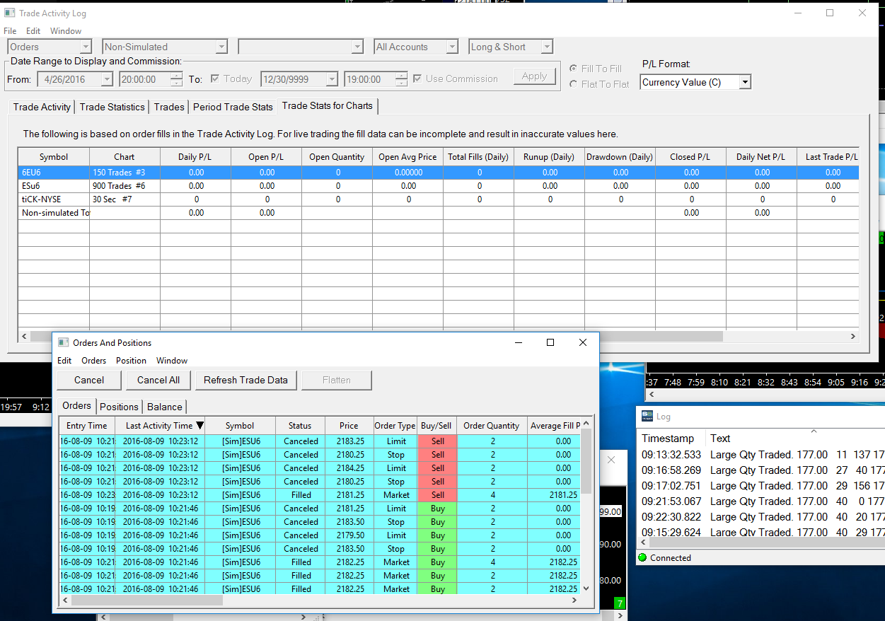 Hello, I am trying to view my Open Positions and P and L when Sim trading. Unfortunately it is not grabbing my Sim Trades (Trade Simulation Mode On) and it seems those trades are not able to be included in any visible P and L (Trade Activity Log --> Trade Stats for Charts) Is there a way to see these trades and the Trade Stats? |