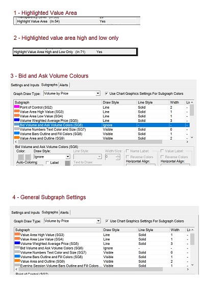 I too like this author am having a real difficult time finding how to have the Value Area one colour and outside the Value Area another colour Here's what Ive done so far - please also see attached and numbered screenshots: 1 - I have 'Highlight Value Area' set to yes 2 - I have 'Highlight Value Area high and low only' set to yes 3 - In Subgraphs I think I have "Bid Volume and Ask Volume" colouring set to "None", or rather "Ignore" 4 - These are my general subgraph settings 5 - please see my attached end result Are you able to further instruct me to know what I'm missing. Ive read the pages of documentation posted above, read and applied everything in this thread so any specific and direct instruction would be really helpful. Many Thanks |