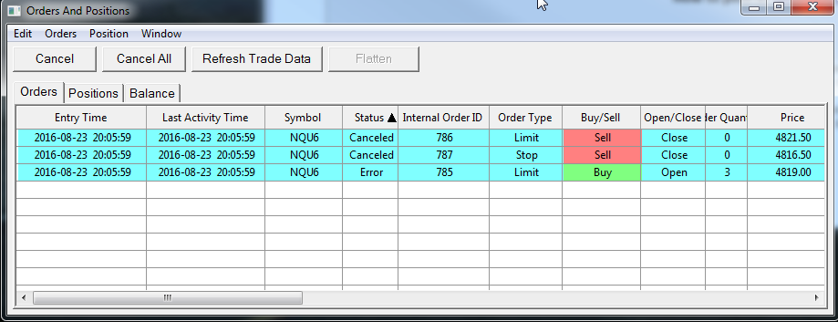 I'm connected to the datafeed, but it seems that I'm not properly connected to the order server at TransAct. When I set a limit order the order is immediately cancelled, and it does not show my balance under the balance tab of Order and Positions. Thanks |