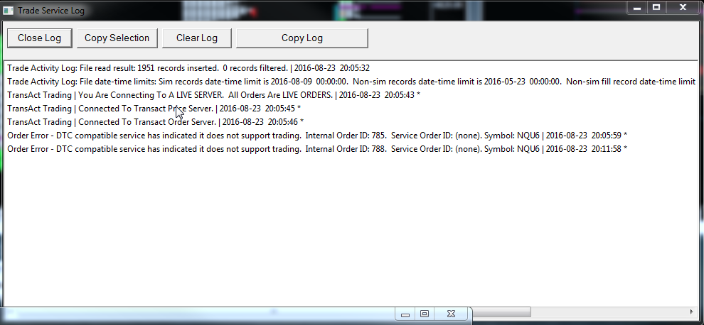 Hi, When I attempt to trade live with TransAct, my orders are immediately cancelled. Below is the error I'm recieving. Thanks. Trade Activity Log: File read result: 1896 records inserted. 0 records filtered. | 2016-08-23 18:21:38 Trade Activity Log: File date-time limits: Sim records date-time limit is 2016-08-08 00:00:00. Non-sim records date-time limit is 2016-05-22 00:00:00. Non-sim fill record date-time limit is 2015-08-24 00:00:00. | 2016-08-23 18:21:38 TransAct Trading | Request To Bypass Order Placement Has Been Received. | 2016-08-23 18:21:49 TransAct Trading | You Are Connecting To A Live Price Server | 2016-08-23 18:21:49 * TransAct Trading | Connected To Transact Price Server. | 2016-08-23 18:21:50 * TransAct Trading | You Are Connecting To A LIVE SERVER. All Orders Are LIVE ORDERS. | 2016-08-23 18:22:18 * TransAct Trading | Connected To Transact Price Server. | 2016-08-23 18:22:22 * TransAct Trading | Connected To Transact Order Server. | 2016-08-23 18:22:23 * Order Error - DTC compatible service has indicated it does not support trading. Internal Order ID: 767. Service Order ID: (none). Symbol: NQU6 | 2016-08-23 18:22:55 * TransAct Trading | You Are Connecting To A LIVE SERVER. All Orders Are LIVE ORDERS. | 2016-08-23 18:35:55 * TransAct Trading | Connected To Transact Price Server. | 2016-08-23 18:35:58 * TransAct Trading | Connected To Transact Order Server. | 2016-08-23 18:35:59 * Order Error - DTC compatible service has indicated it does not support trading. Internal Order ID: 770. Service Order ID: (none). Symbol: NQU6 | 2016-08-23 18:36:34 * |