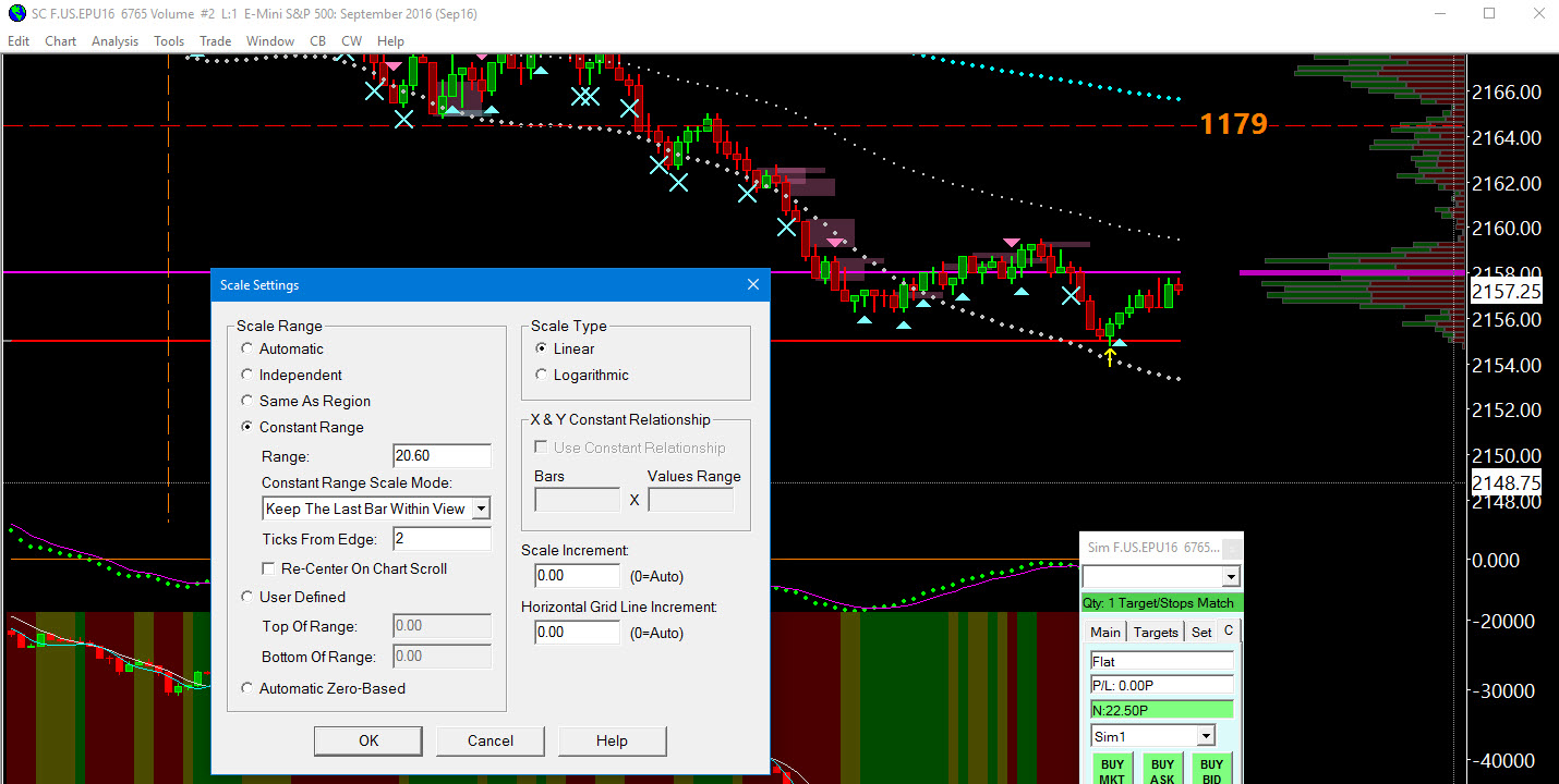 How do I expect it to work? the same way as Auto does. As I scroll back in a chart, I expect the bars that are visible left to right to be able to be seen as long as they are within the constant range, in my case 20 points, not past the top or bottom of the scale. Also, when I press the END key to get to the last / current bar in real time, I do not expect it to always put that price in the middle of the scale vertically. I have set the # of ticks from edge to 2 on a constant range scale mode with the constant range to 20.0. I'm not trying to be difficult, what other details are you looking for? John |