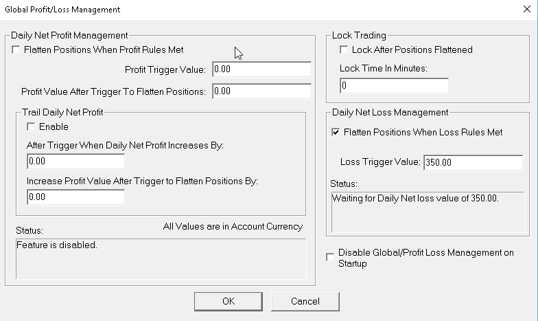 Yes. Refer to: http://www.sierrachart.com/index.php?page=doc/GlobalProfitLossManagement.php Sierra Chart Support - Engineering Level Your definitive source for support. Other responses are from users. Try to keep your questions brief and to the point. Be aware of support policy: https://www.sierrachart.com/index.php?l=PostingInformation.php#GeneralInformation For the most reliable, advanced, and zero cost futures order routing, *change* to the Teton service: Sierra Chart Teton Futures Order Routing |