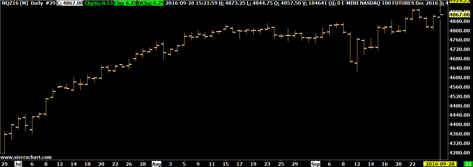 Settlement for NQ on 09/27/16 is 4860.75 in the QuoteBoard SettlementPrice and it matches the CME website. http://www.cmegroup.com/trading/equity-index/us-index/e-mini-nasdaq-100_quotes_settlements_futures.html This is good. However, the Closing price on a Historical Daily Chart with OHLC is 4815.00. How did you get the Settlement price out of the OHLC study on a historical Daily? Date Time Of Last Edit: 2016-09-28 18:46:09