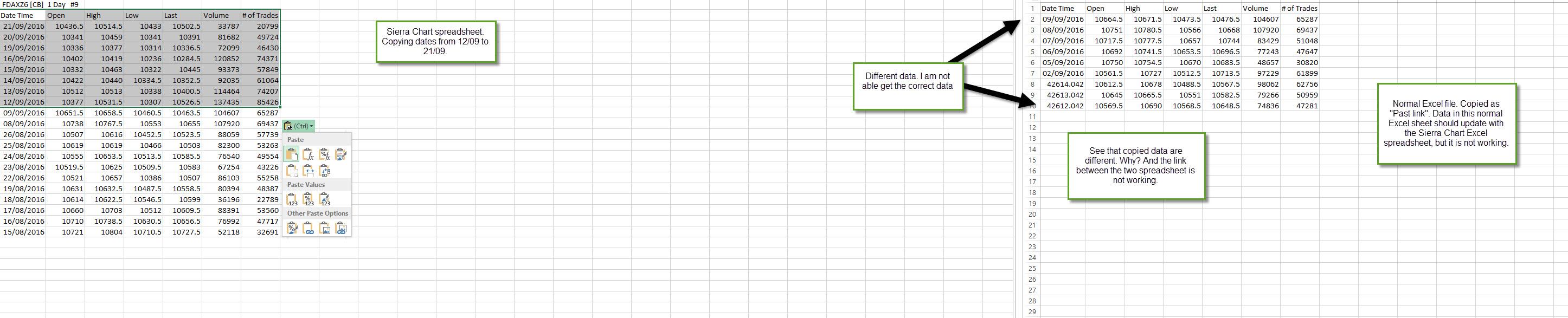 The way that Excel is processing the data on the clipboard must be in a way which is different than the way that Sierra Chart would process it. Also there is no way to establish an actual real-time link between the two spreadsheets. That is simply not supported at all. Consider using the Use Excel input: Spreadsheet Study Inputs Sierra Chart Support - Engineering Level Your definitive source for support. Other responses are from users. Try to keep your questions brief and to the point. Be aware of support policy: https://www.sierrachart.com/index.php?l=PostingInformation.php#GeneralInformation For the most reliable, advanced, and zero cost futures order routing, *change* to the Teton service: Sierra Chart Teton Futures Order Routing Date Time Of Last Edit: 2016-09-21 11:19:56