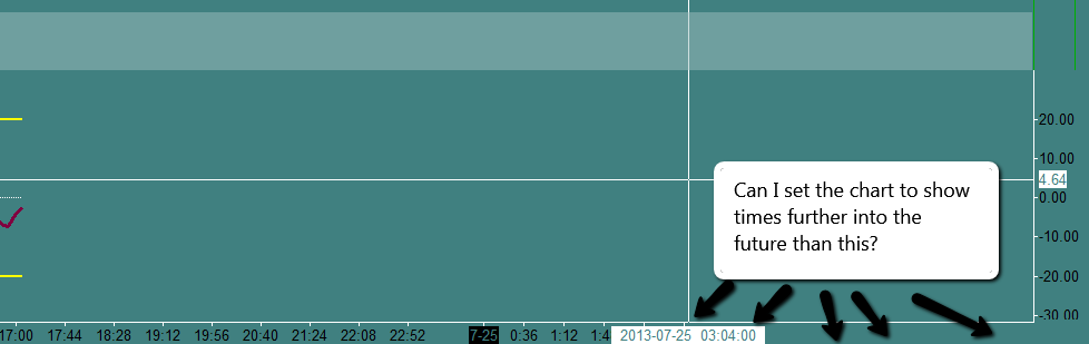 Hi, Is it possible to get the chart to scroll further into the future than what I am seeing? On the attached 4 minute chart I have scrolled until the time stops 10 hours into the future, after that there is just blank space on the time axis but the cross-hair cursor won't track there and I can't draw a vertical line in that space. I would like to be able to plot drawing objects on the chart for the next day (or even two) in advance. Thanks! |