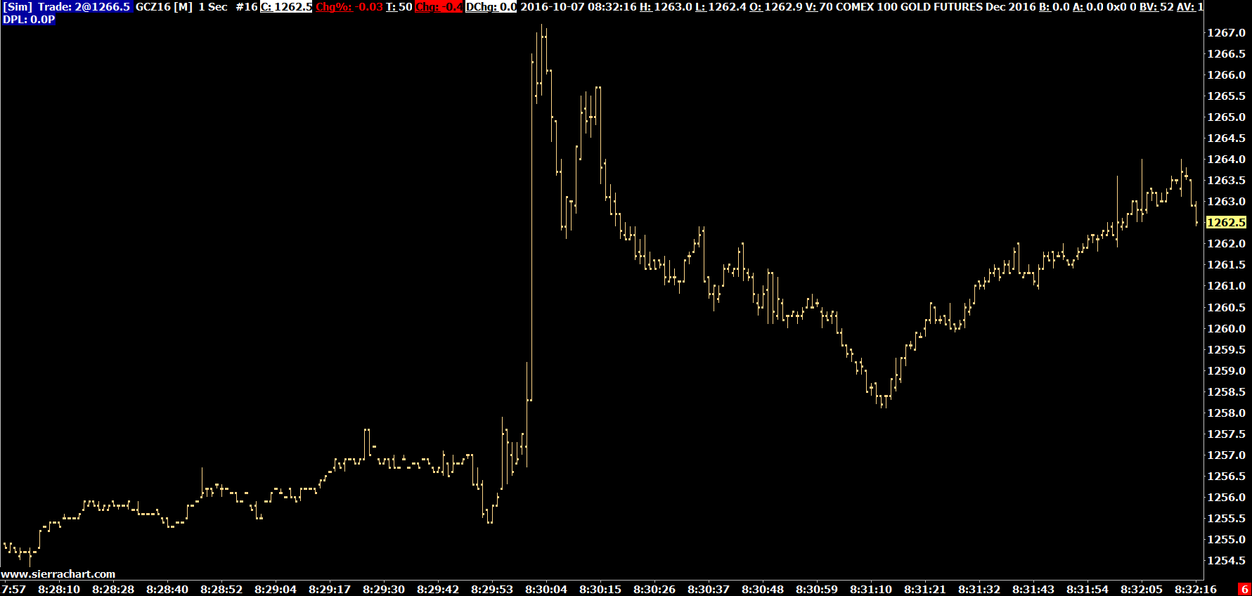 Today 10/7 I experienced what I believe is Sierra Chart's faulty management of moving a stop to breakeven. Details are as follows: Before the NFP news release I placed on Sierra Chart a limit order to sell GC (Dec'16 contract) at 1265.0, with an attached profit target of 40 ticks, stop loss of 35 ticks, and a Move to Breakeven for Stop with Offset in Ticks Triggered, BE Level Offset 0 and Trigger Offset 30. Order was filled at 1265.0 at 08:30:01. Stop was filed at 1265.9 at 08:30:02. My broker registers an attached stop loss order, transmitted by Sierra Chart, of 1265.0 filled at 1265.9. If SC had worked properly, after the 1265.0 fill, price needs to have traded 1262.0 and then gone back up to at least 1265.9. Nonetheless, in between the 1265.0 fill and the 1265.9 fill, 1262.0 did not trade. According to Time Sales, the low price in between fills was 1262.3. Therefore the stop should not have been moved to 1265.0, and should have remained at 1268.5. 1268.5 never traded. After the 1265.0 fill, 1262.0 first traded at 08:30:22. Then 1261.0 traded at 08:30:30, before 1265.0 traded again. How is this possible? |
