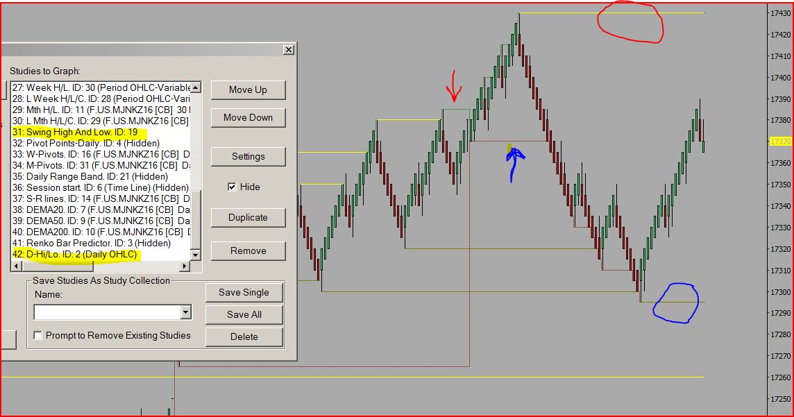Re post #11. Okay, so I see you might have added to the documentation (Chart Studies: Study Display Order) after I made my post as it is now clear the Study at the bottom of the list will be drawn LAST. However I should have said in post #10 that I had already tried that as the documentation at that time was not clear. So I still stand by my 'accusation' that the Extended Lines of the Swing Hi/Lo study is drawing over the top of other Studies even though the other study is the LAST in the list. Attached as screen grab SC1 is a chart showing Stair Step Daily Hi/Lo as Green (Hi) and Red (Lo) dots. Arrows point to the 'naked' lines so you can see what tbey look like and then the same coloured hand drawn circles point to where they should be printing on TOP of the yellow and olive Extended Swing Lines where they overlap at the current Hi and Lo of the day. I think you can agree Green Hi dots should show up over Yellow Swing lines as you can see the Daily Hi/Lo study is the LAST in the list and Green is a darker colour than Yellow. To prove my point SC2 is the same screen grab EXCEPT I have made the Hi/Lo of the Day Green and Red dots equal to 3 pixels so they now overlap the 1 pixel width of the Extend Swing Hi/Lo lines. Note that it is only the overlap pixel on each side of the Extend Line that you can see for the Red/Green Day Hi/Lo dots - you will note you can still see the Yellow/Olive Extend Swing lines running through the middle of the dots. Date Time Of Last Edit: 2016-10-26 05:15:22