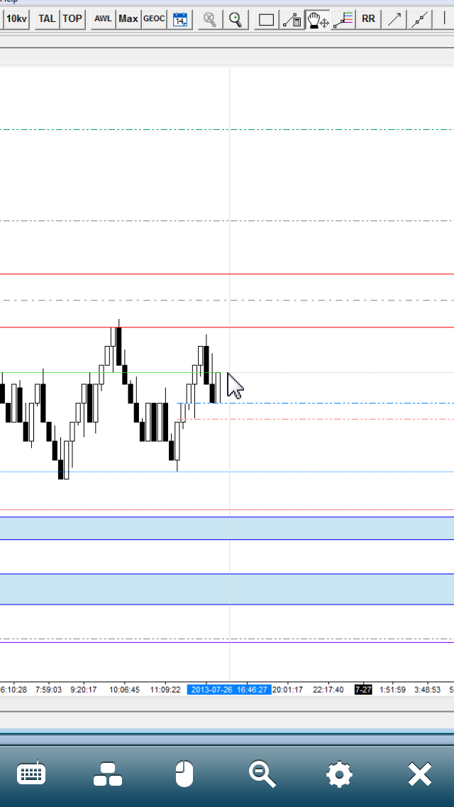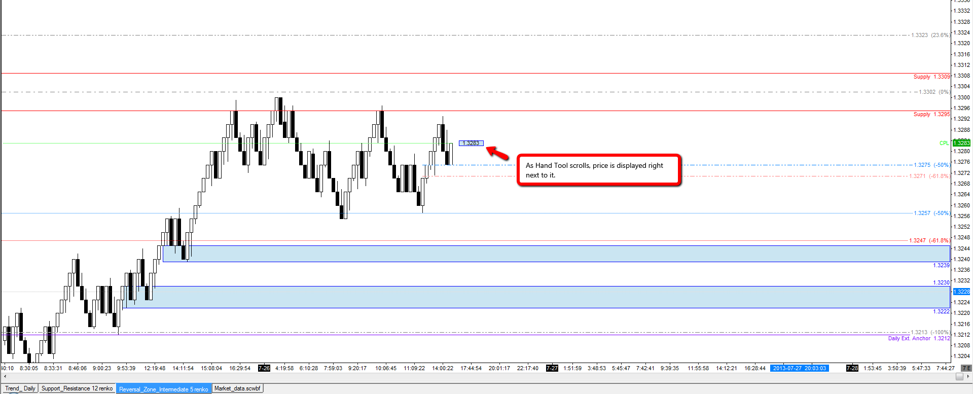 SC, would it be possible to add an option to the hand tool, which would display just the price of the current tool location. Why? 1) using a remote desktop software such as Teamviewer or Logmein only gives limited real estate to view the platform. Knowing what price the tool is displaying is difficult. See sample images. One from Desktop, one taken using Logmein on iphone. |