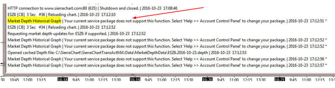 This is impossible for us to understand from our perspective because we do not know what this custom chart is doing or how it is implemented. But in general if you do not see the historical market depth data displayed, then it is not going to work properly. Sierra Chart Support - Engineering Level Your definitive source for support. Other responses are from users. Try to keep your questions brief and to the point. Be aware of support policy: https://www.sierrachart.com/index.php?l=PostingInformation.php#GeneralInformation For the most reliable, advanced, and zero cost futures order routing, *change* to the Teton service: Sierra Chart Teton Futures Order Routing |