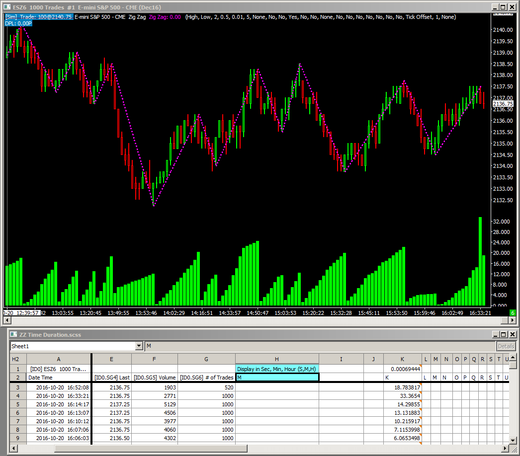 To use the ZZ Time Duration spreadsheet study on an existing chart: -Put the ZZ Time Duration.scss from post#3 in your Sierra Chart \Data folder. -Put the attached study collection file ZZ Time Duration-.StdyCollct in your Sierra Chart \Data folder. -Focus your chart and go to Analysis >> ZZ Time Duration- and choose No when asked if you want to 'Clear Existing Studies On Chart'. -Go to your existing Zigzag study settings and set 'Additional Outputs For Spreadsheets' to Yes. -Note the ID# of your existing Zigzag study. -On the spreadsheet: Edit the formula in cell K3 to reference the ID# of your existing Zigzag study. (If it's not ID1). |