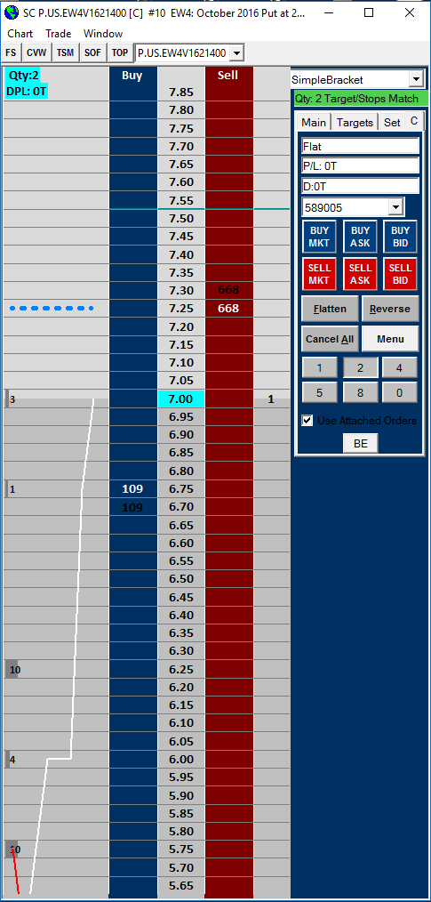 I am running CQG feed and testing options on the Sierra DOM, but the tick increment that displays on the DOM is incorrect. ES options are priced at .05 tick increments only for those options priced under 5.00, everything else is priced in .25 increments. Since yours are priced in .05 increments all the way up, there are 4 dead tick zones between each tradeable price. This is the case with all strikes for ES. So for example an option strike that should be 10.00, 10.25, 10.50, 10.75,11.00 etc is priced as 9.95, 10.00, 10.05, 10.10 etc which are not tradeable prices other than the 10.00 value. 5 cent tick increments are tradeable at 5.00 and below, so 4.95, 4.90 etc are valid tradeable prices. |