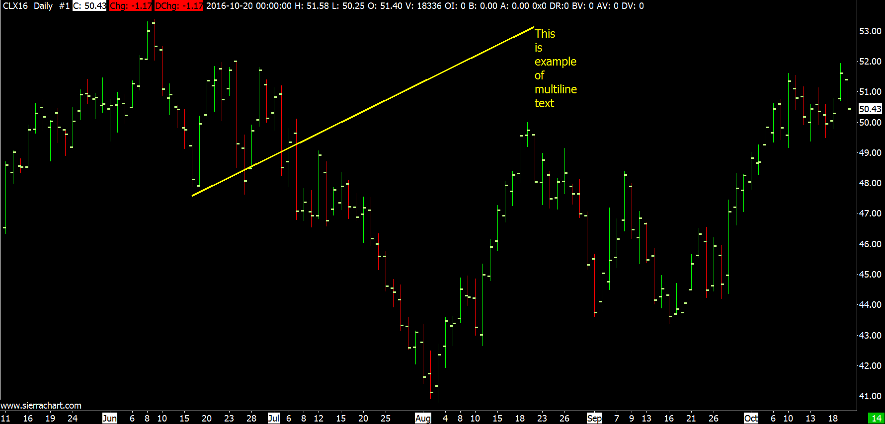 2, 3. This is now resolved. Regarding multiline text for a Line drawing, we confirmed that this does work properly. Here is an example set with the Modify Text command: http://www.sierrachart.com/image.php?Image=1478254204739.png Sierra Chart Support - Engineering Level Your definitive source for support. Other responses are from users. Try to keep your questions brief and to the point. Be aware of support policy: https://www.sierrachart.com/index.php?l=PostingInformation.php#GeneralInformation For the most reliable, advanced, and zero cost futures order routing, *change* to the Teton service: Sierra Chart Teton Futures Order Routing |