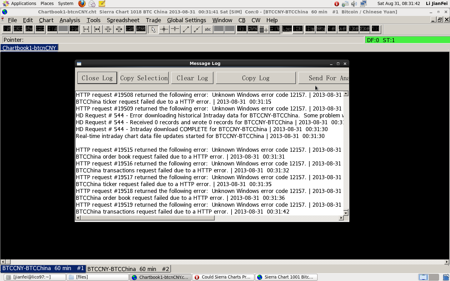 This is a very unusual error. We are not familiar with this error code. Are you running any firewall software? We do not have this problem running on Windows. Here is the current chart that we have: http://www.sierrachart.com/image.php?l=1377889171284.png Sierra Chart Support - Engineering Level Your definitive source for support. Other responses are from users. Try to keep your questions brief and to the point. Be aware of support policy: https://www.sierrachart.com/index.php?l=PostingInformation.php#GeneralInformation For the most reliable, advanced, and zero cost futures order routing, *change* to the Teton service: Sierra Chart Teton Futures Order Routing Date Time Of Last Edit: 2013-08-30 19:00:35