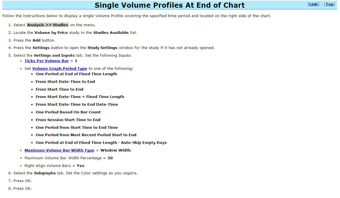 Same as previously. Set this Input: http://www.sierrachart.com/index.php?page=doc/VolumeByPrice.php#InputVolumeGraphPeriodType To One Period from Start Time to End Time and specify the start and end times with the Study Inputs. The study now properly handles reversed start and end times. Sierra Chart Support - Engineering Level Your definitive source for support. Other responses are from users. Try to keep your questions brief and to the point. Be aware of support policy: https://www.sierrachart.com/index.php?l=PostingInformation.php#GeneralInformation For the most reliable, advanced, and zero cost futures order routing, *change* to the Teton service: Sierra Chart Teton Futures Order Routing |