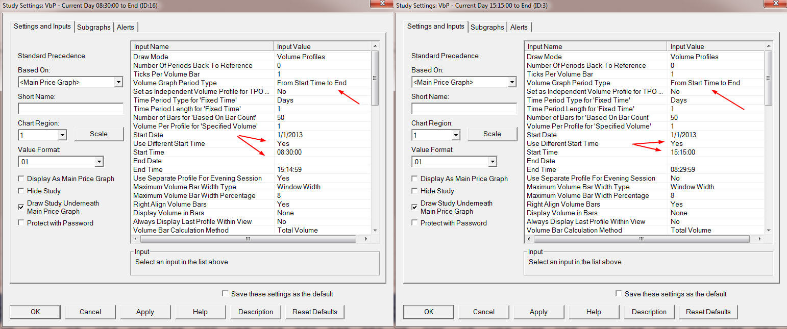 You need to add two instances of the Volume by Price study. Set this Input: http://www.sierrachart.com/index.php?page=doc/VolumeByPrice.php#InputVolumeGraphPeriodType To One Period from Start Time to End Time and specify the start and end times with the Study Inputs. Sierra Chart Support - Engineering Level Your definitive source for support. Other responses are from users. Try to keep your questions brief and to the point. Be aware of support policy: https://www.sierrachart.com/index.php?l=PostingInformation.php#GeneralInformation For the most reliable, advanced, and zero cost futures order routing, *change* to the Teton service: Sierra Chart Teton Futures Order Routing |