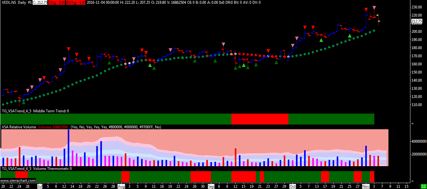 I started using Sierrachart to scan NSE Indian Stock with Tradeguider. I have started using the SC Data EOD data provided by Sierra chart and I have a problem here. The tradeguider scanner generates a indicator only for a bar which is finished and now if we look into the following chart the bar of 4th Oct is still shown as under formation and not completed so i am not getting any indicators. How can we show this as completed as its EOD data and the day is already closed you can see the following chart and the symbol is VEDL.NS http://www.sierrachart.com/image.php?Image=147839218124.png Finally is there any possibility to connect to yahoo or google finance to get Indian stock data. |